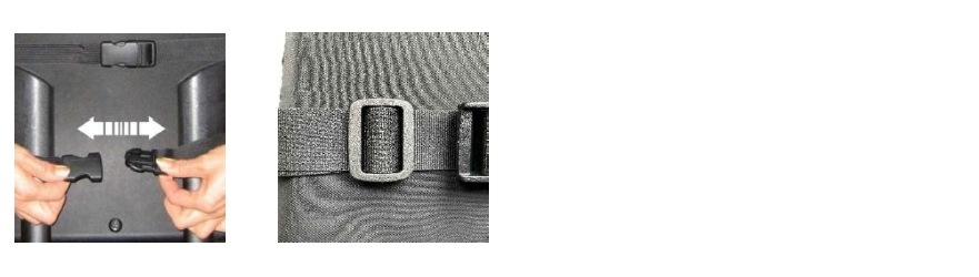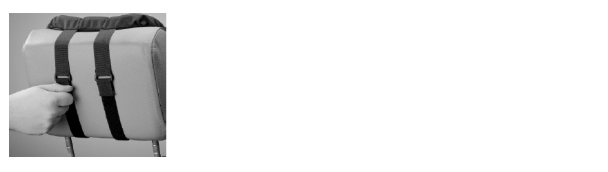 Die Befestigungsbänder werden für die Montage um den Stuhl herumgeführt und rückseitig unter geringer Spannung mit der Steckschnalle verbunden. Sollte eine Längenanpassung der Bänder erforderlich sein, kann dieses durch ein Verschieben der Leiterschnalle erfolgen.