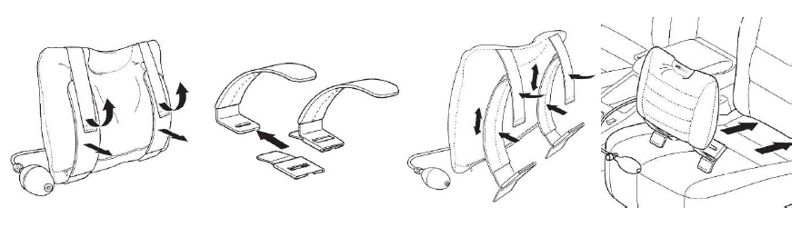 Alle benötigten Teile sind im Lieferumfangenthalten. Die Fixatoren (Klemmplatten) werden durch den Schlitz zwischen Sitz- und Rückenfläche geschoben und auf der Rückseite des Sitzes verkeilt. Damit wird verhindert, dass das Kissen später nach vorne wegrutscht. Das Befestigungsband kann, dank Klettverschlüssen, jederzeit passend justiert werden. Eine kinderleichte und schnelle Montage.