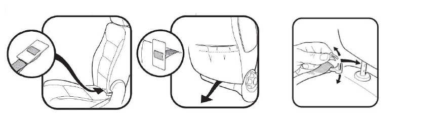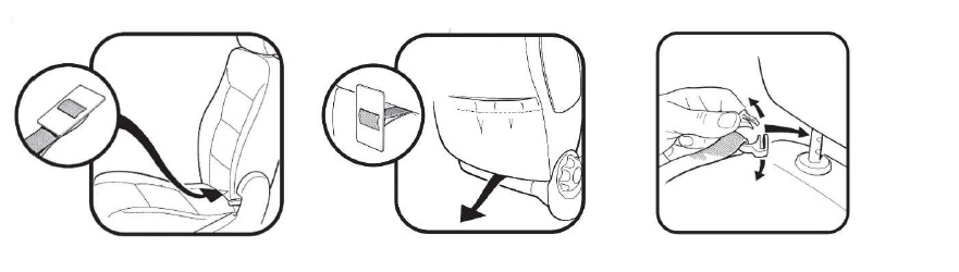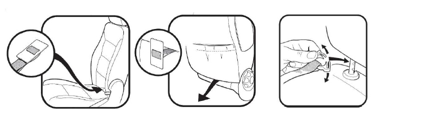 Im Lieferumfang enthalten sind außerdem zwei L-förmige Befestigungsbügel für Fahrzeuge mit geschlossenem Rückenteil. Für die Montage muss der Sitz in Liegeposition gebracht werden. Die an Haltebändern angebrachten Bügel werden dann in den Schlitz zwischen Sitz- und Rückenfläche gedrückt. Der Sitz kann anschließend wieder in eine aufrechte Position gebracht werden.
